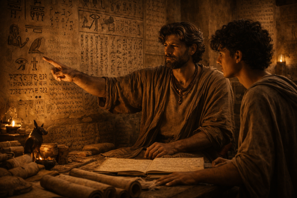 Nos sentábamos en una sala apartada, donde se guardaban tablillas y rollos que ya nadie consultaba. Yo pronunciaba las palabras en voz baja, él las repetía, y luego las dejaba reposar hasta que adquirían en él una claridad que yo nunca había alcanzado. Con el tiempo, empezó a anticiparse. Antes de que yo terminara una frase, él ya conocía su estructura.