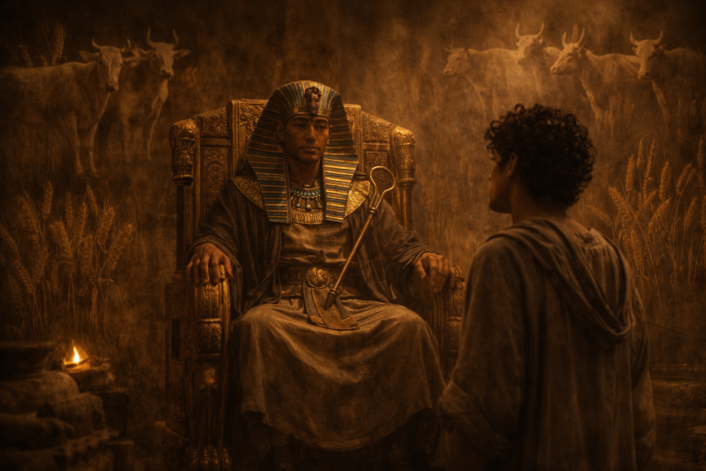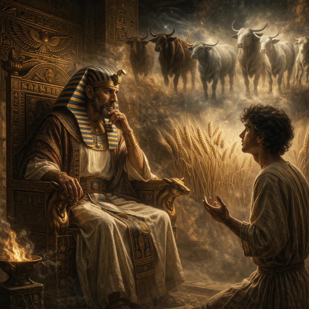Las vacas y las espigas ocuparon el palacio durante semanas. Llegaban intérpretes de distintos lugares, cada uno con una explicación distinta que no lograba imponerse. Yo escuchaba en silencio. No buscaba el significado del sueño, sino su forma. Toda repetición numérica implica una estructura, y toda estructura exige un desarrollo.